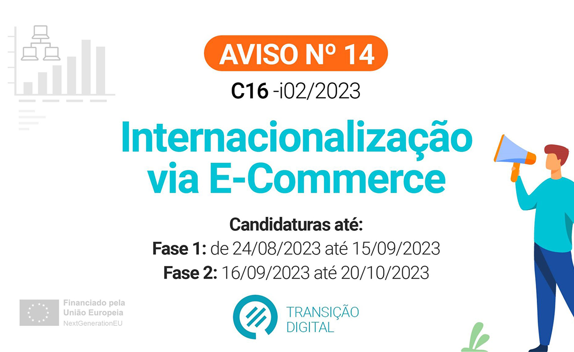Mais informações em https://recuperarportugal.gov.pt/candidatura/14-aviso-de-abertura-de-concurso-para-projetos-no-ambito-da-medida-internacionalizacao-via-e-commerce-aviso-de-abertura-de-concurso-n-o-14-c16-i02-2023/