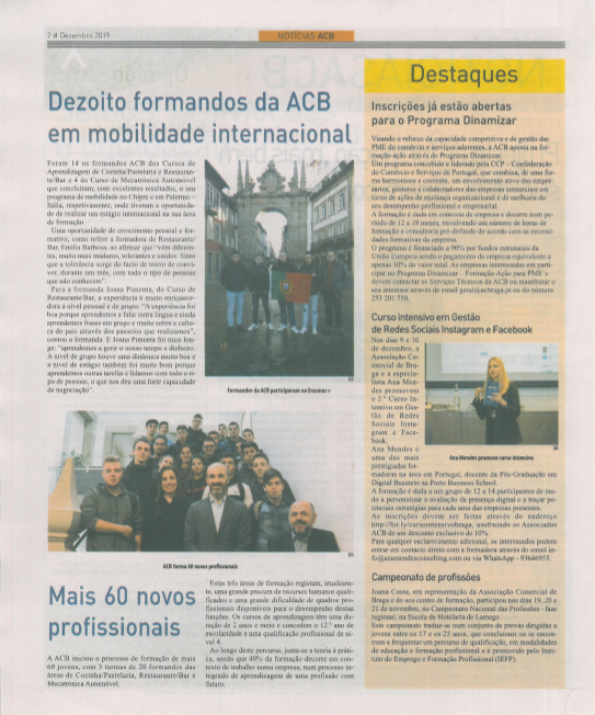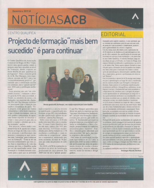 No Suplemento ACB deste mês as notícias em destaque são: Centro Qualifica, as experiências de erasmus dos formandos ACB, os novos cursos de aprendizagem, o Programa Dinamizar, o Bolo Rei Gigante, os Amigos do Café, as formações a iniciar, informações legislativas e, ainda, os últimos protocolos a assinados.