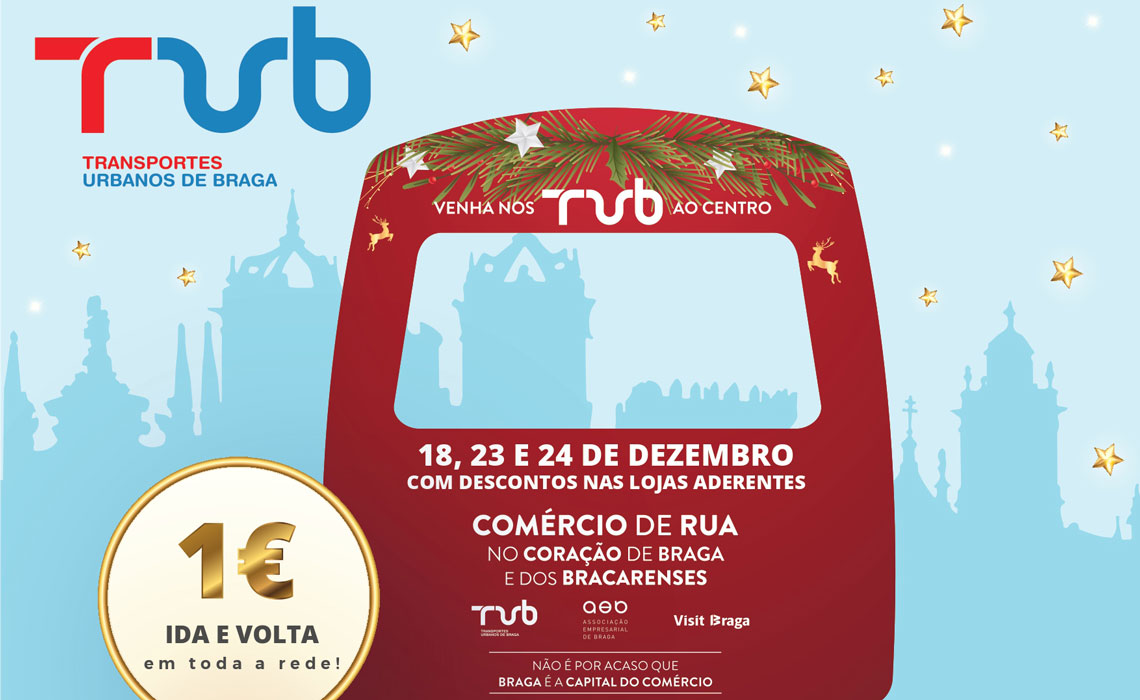 A Associação Empresarial de Braga volta a associar-se à campanha de Natal dos TUB, que desafiam os bracarenses a viajarem em toda a sua rede pelo valor simbólico de 1€ (ida e volta) até ao centro, com o objetivo de fomentar uma maior dinamização económica do comércio do centro da cidade e ao mesmo tempo promover a mobilidade urbana sustentável.